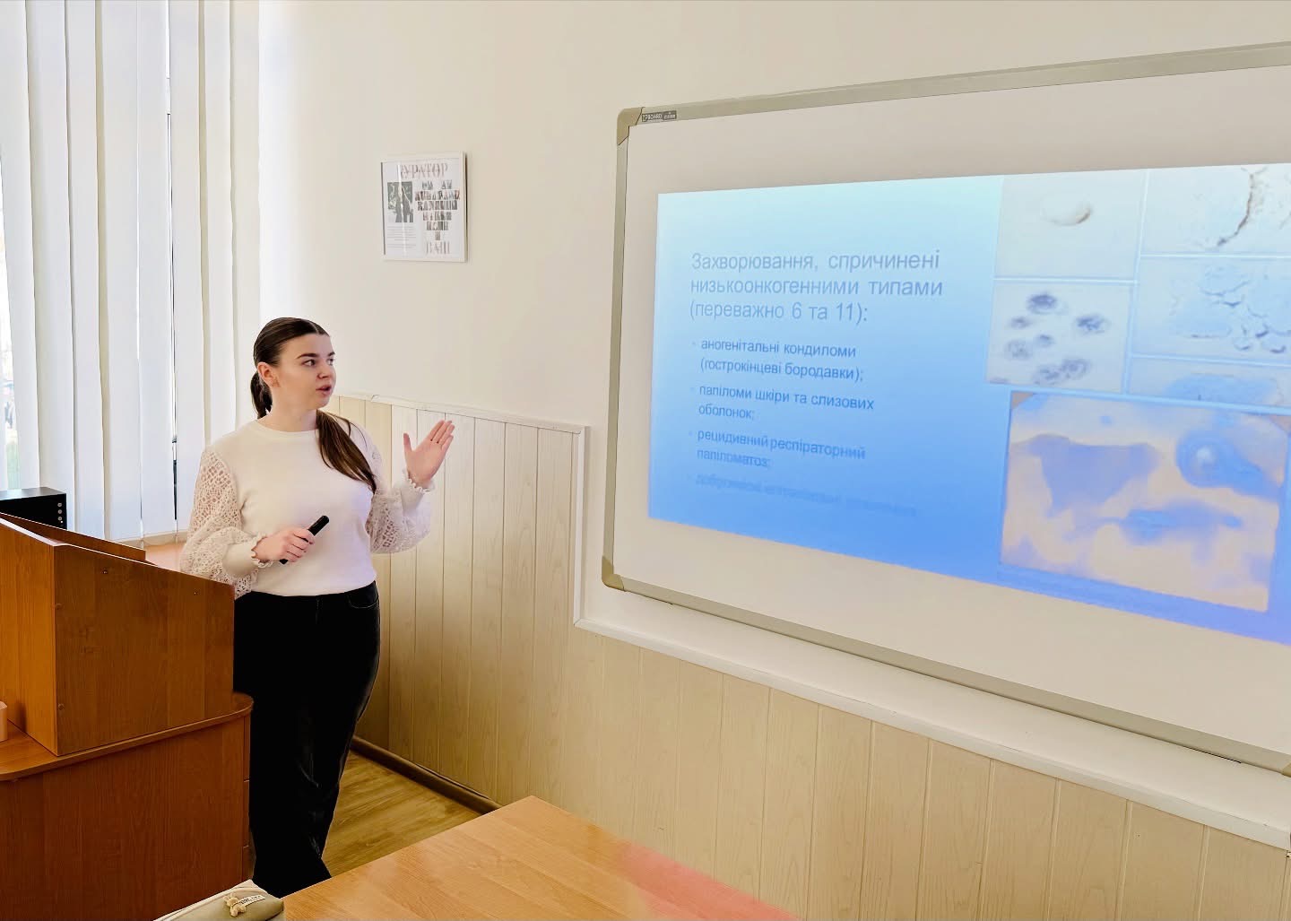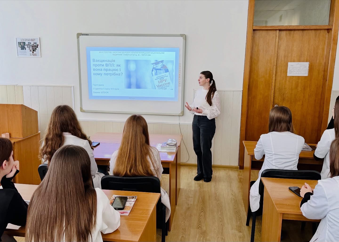 Дарина поділилася сучасними доказовими даними, пояснила значення вчасної профілактики та розвіяла найпоширеніші міфи про вакцинацію. Студенти дізналися, чому вакцинація є одним із найефективніших способів захисту від вірусу папіломи людини та повʼязаних із ним захворювань.