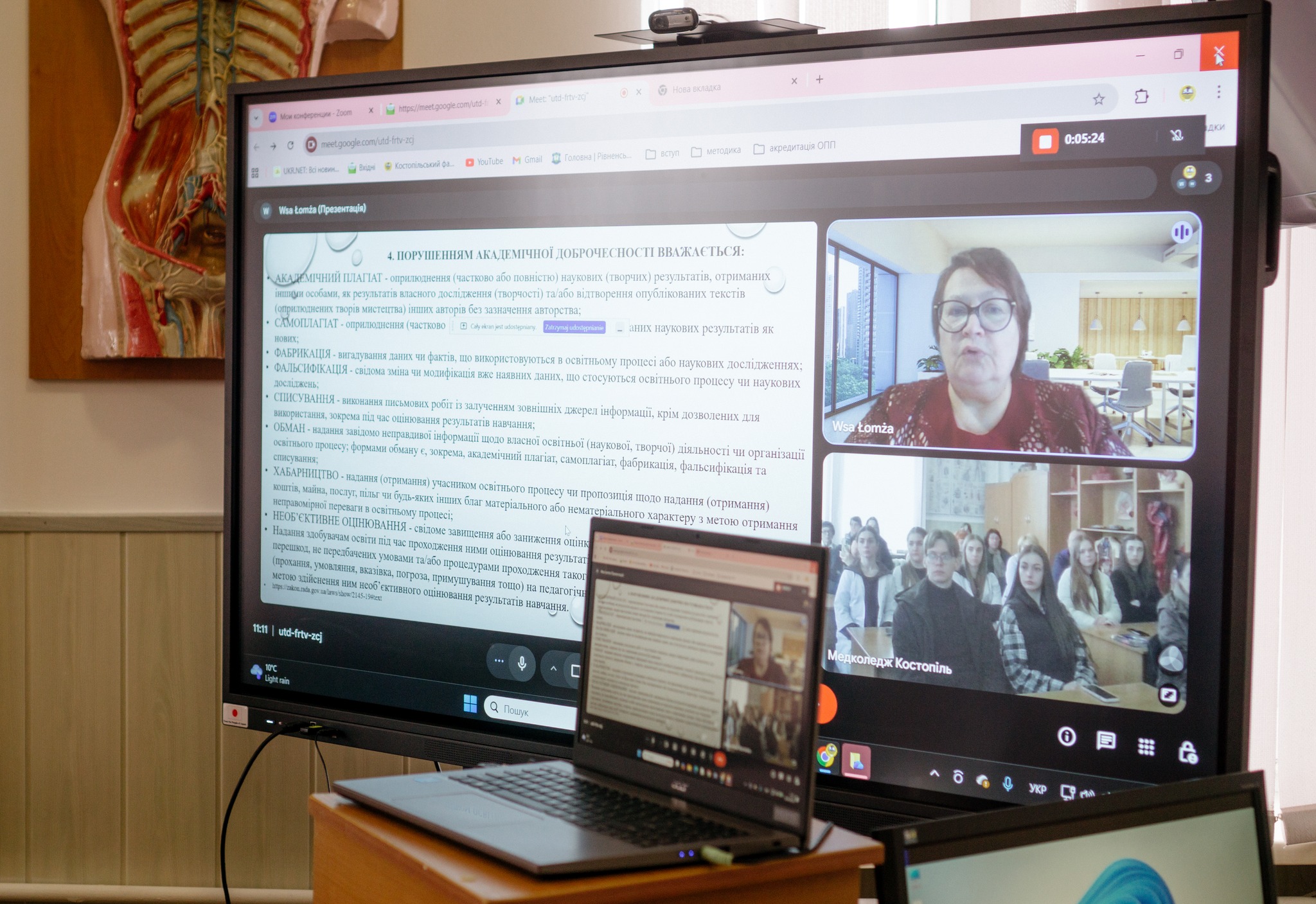 Під час виступу лекторка акцентувала увагу на ключових засадах академічної доброчесності, розглянула основні види її порушень та наголосила на важливості формування культури чесного навчання серед студентської молоді. Особливий інтерес викликали практичні приклади з міжнародного досвіду, а також рекомендації щодо запобігання академічному плагіату та недоброчесній поведінці, кращому розумінню порушеної проблематики.